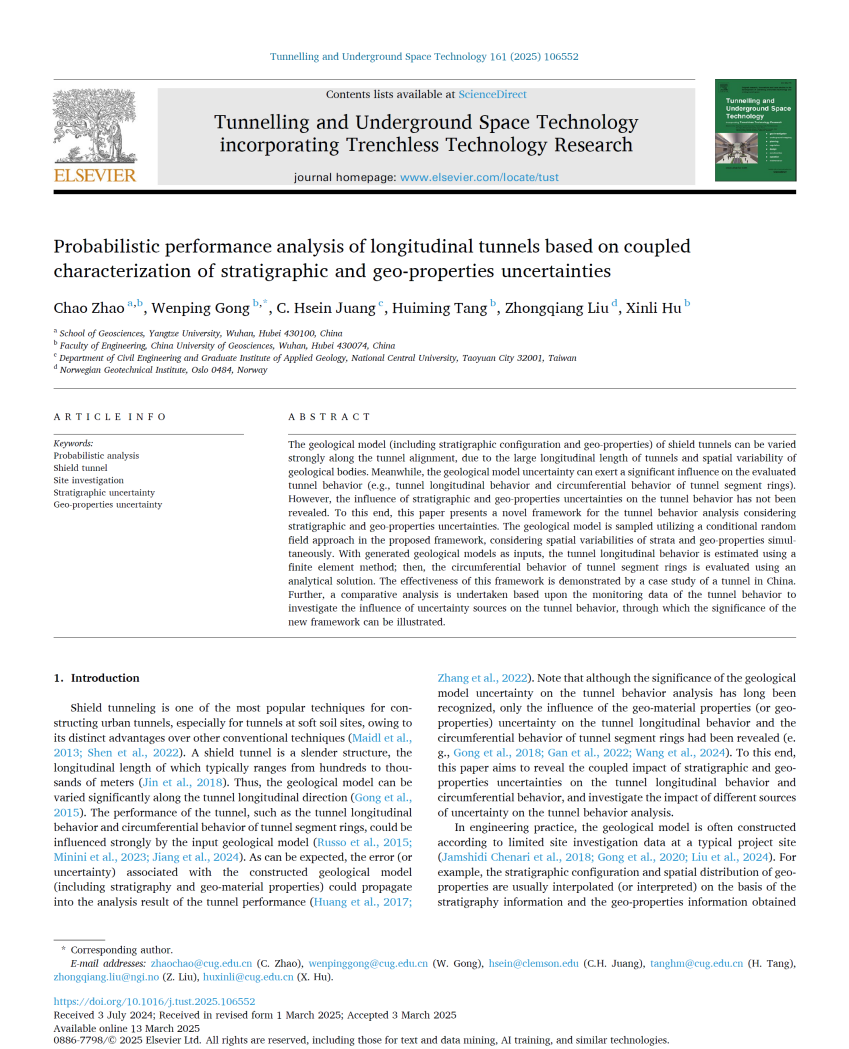 特任教授赵超在《Tunnelling and Underground Space Technology》发表题为“Probabilistic performance analysis of longitudinal tunnels based on coupled characterization of stratigraphic and geo-properties uncertainties”的研究论文(图1)。赵超为第一作者,色情影片