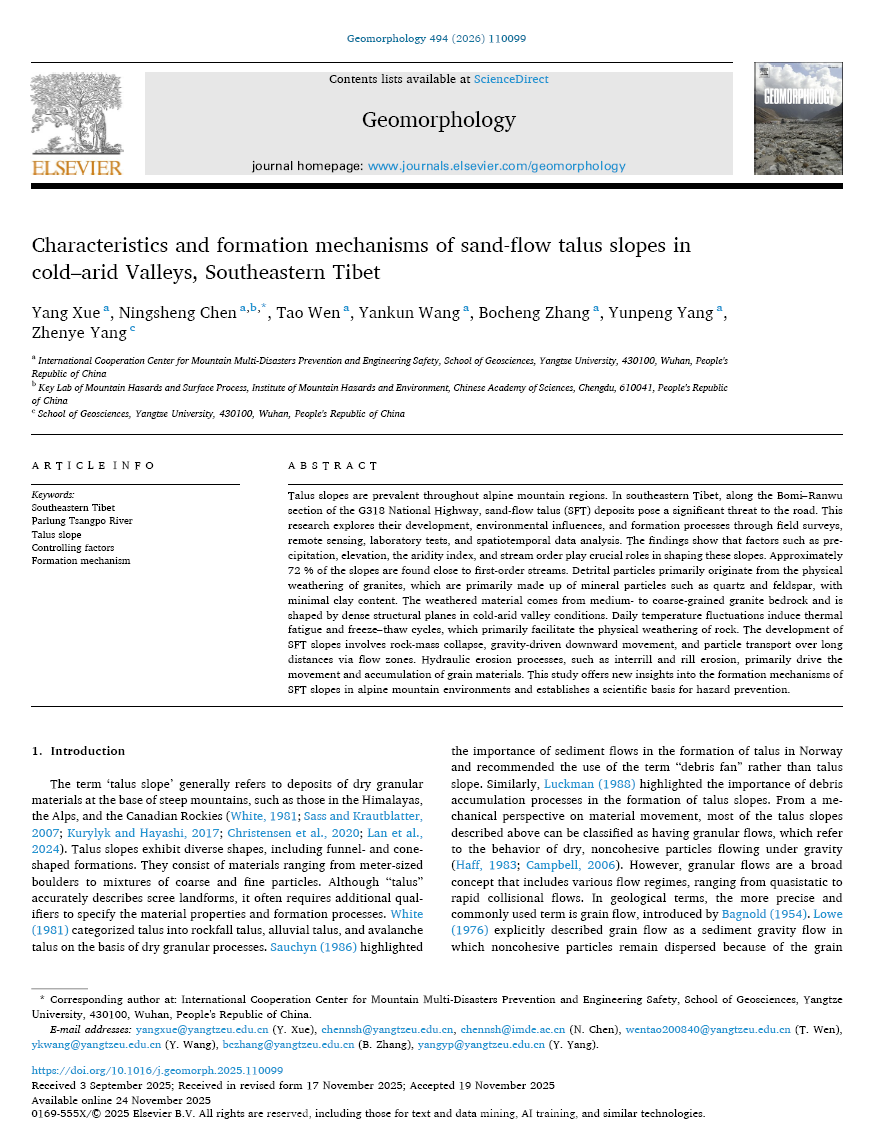 地质系、工程地质研究中心团队成员薛阳副教授在地球科学领域老牌期刊《Geomorphology》(中科院大类二区)上发表题为“Characteristics and Formation Mechanisms of Sand-Flow Talus Slopes in Cold–Arid Valleys, Southeastern Tibet”的论文(图1),薛阳副教授为第一作者,陈宁生教授为通讯作者,色情影片