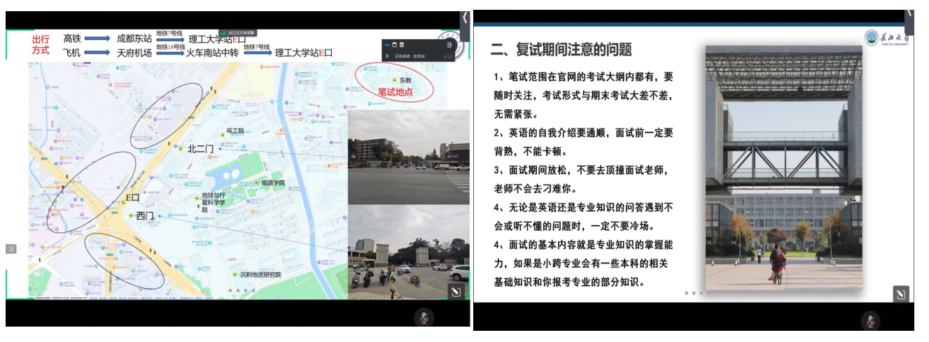 来自成都理工大学的杜安业为同学们介绍了学校周边环境,在出行方式和酒店预订等方面给予大家温馨提示,还特意收集了去年考取其他学院的校友联系方式,方便同学们进行更有针对性的联系。去年成功调剂到昆明理工大学的王毅博为大家分享了自己的调剂经验,以及如何拓展调剂信息的搜集渠道、复试时需要注意的问题和面试技巧等。杨肖利同学将中国石油大学(华东)研究生复试的环节、科目内容等为大家进行深入浅出的讲解,重点强调了保持良好心态的重要性,鼓励大家自信应考,避免焦虑紧张。