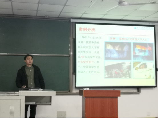 接着,为进一步提升学生安全防范意识,加强宿舍安全管理工作,张严老师面对全体班长进行了宿舍文明安全教育。首先,他对色情影片 前期宿舍安全检查情况进行了通报与总结,叮嘱同学们要注意用电安全,排查可能存在的安全隐患,杜绝使用任何违规电器。紧接着,张老师为大家讲解了宿舍火灾发生的原因、火灾的预防以及自救措施,强调学生应主动排查安全隐患,防范于未然,做到“我懂安全,我要安全,事事安全,人人安全”。