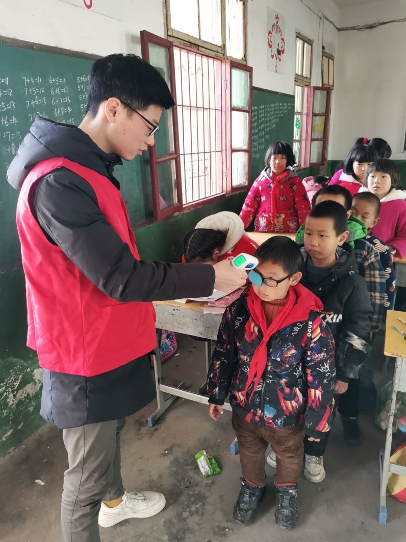 每天早上七点,张梦琪准时出现在学校大门口,为每个进入学校的学生和家长测量体温,提醒大家戴口罩。9点左右,早上的工作刚结束,又到了上午给学生们测体温的时间,还没来得及坐一会,他已经在各教室里穿梭。“请大家在走廊里排好队,听到‘嘀’的一声就测好啦。”每天三次的进教室测温,让小朋友们对这位大哥哥非常熟悉,课间的时候还经常爬到张梦琪的身上跟他打闹。“虽然工作比较琐碎,但我觉得很充实,很快乐。”回忆起他的志愿者经历,他说道,“学校人员密集,并且绝大多数是小朋友这类特殊人群,为防疫工作增加了难度与压力,听说防疫人手吃紧的消息后,我就直接参加了学校的抗疫工作,也想为母校做点力所能及的事,为孩子们做个榜样。”
