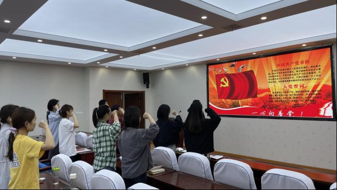 会议第一项,全体党员唱国歌,重温入党誓词。