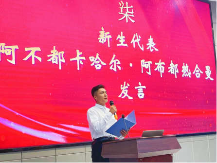 阿不都卡哈尔·阿布都热合曼作为新生代表说“成为地质工作者建设家乡是我的梦想,经过大学四年,我们要像冯校长说的那样,立大志,明大德,成大才,担大任!”
