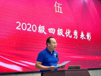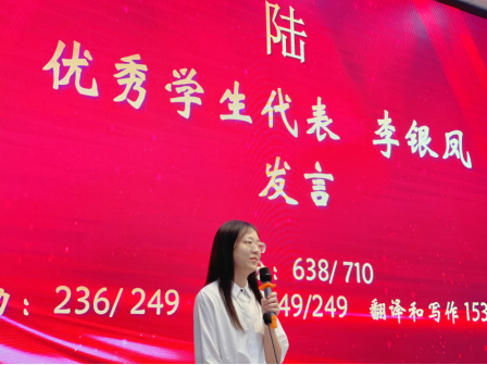 四级优秀个人李银凤作为优秀学生代表,在发言中勉励新同学“做三四月的事,八九月自然有答案。让我们朝着坚定的目标一直走下去,不辜负自己的努力与汗水!”