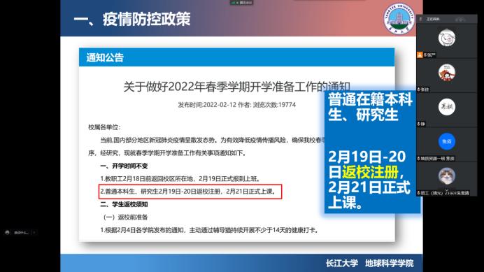 主题班会从返校时间安排、不能返校的几种情况、返校流程、春季学期重点工作、防电诈等方面展开。首先,辅导员老师为同学们讲解了返校及开学的时间安排,并强调不能擅自提前返校,对因处在中高风险地区、行程码带星号以及特殊原因延迟返校的同学需要办理的手续进行了规定与解答,然后对返校流程的7步骤逐一进行了讲解,特别是对“填报个人行程、查验健康码及行程码”、“准备到校前48小时内核酸报告”、到校报到等重难点进行了耐心的解释说明,并提醒同学们做好返校旅途的个人防护。随后,21、20级将开学补考、19和20级将就业及考研工作,分别作为春季学期重点工作进行了强调与动员,并告诫同学们要捂好自己的钱袋子,谨防电信诈骗。最后,辅导员老师对大家的疑问一一进行了解答,并提醒同学们旅途做好防护。