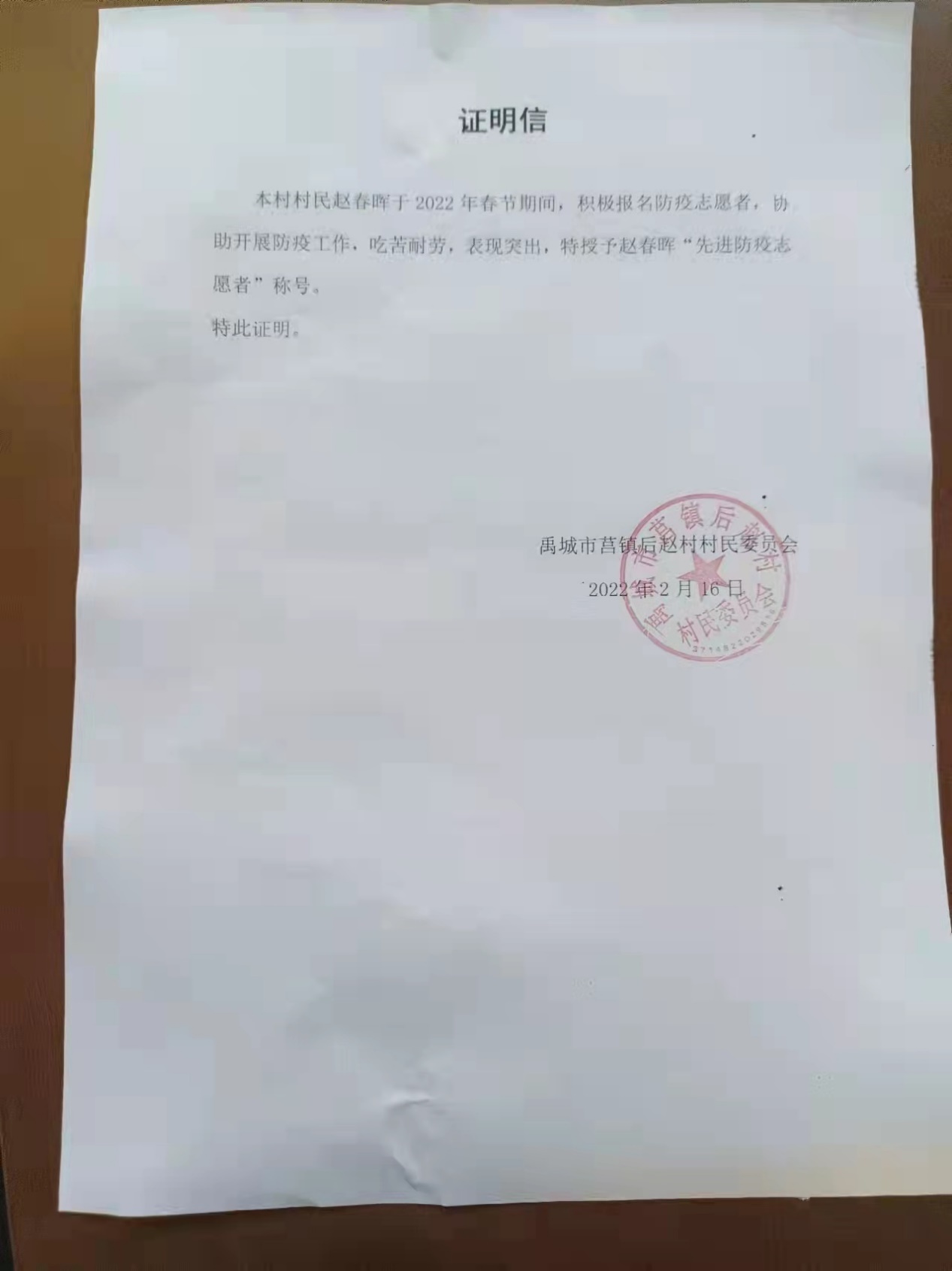 图四 赵春晖抗疫志愿者证明