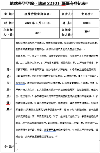 为便于班会开展,学工办事先提炼一份疫情需知,发给各班班主任。班主任与班长领学习疫情防控相关政策要求,在思想上高度重视,坚持“外防输入、内防反弹”总策略、“动态清零”总方针不动摇,增强主动防控意识。落实到个人行动上,一要强化个人防控措施,切实履行个人防控第一责任;二要严格遵守属地和学校防控规定,在健康检测、外卖快递、寝室安全、出行报备等细节上做好日常防护;三要从严从紧遵守校规校纪,如有违规违纪行为,学院将严肃责任追究。班主任老师还温馨提醒同学们临近夏季谨防溺水,近期校区球类比赛较多可以勤加锻炼,留心身边同学的社交动态,对遇到挫折的同学提供关心支持等。