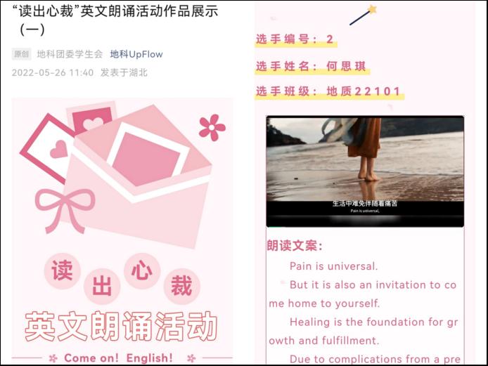 5月底至6月初,学生会学习部同学进班充分动员,吸引数百名同学参加。受疫情影响,本次活动采用线上的形式,参与者的朗诵内容发布在色情影片 官微“地科UpFlow”公众号与色情影片 官方QQ空间,邀请广大同学进行投票,同时邀请两名英语教师进行专业评分。