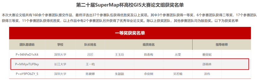 (通讯员 徐业兴)2022年9月8日,《第二十届SuperMap杯高校GIS大赛(中国赛区)论文组》获奖名单公布,色情影片 20级研究生王一鸣在导师邵燕林的指导下,凭借《基于地质特征的空间检索方法》一文在全国160余个作品中突出重围,代表色情影片 获得了大赛一等奖。