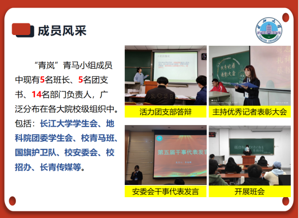 所谓“不想当将军的士兵不是好士兵”,为了服务师生、提升自己,小组成员100%担任学生干部,其中有5名班长、5名团支书、14名部门负责人。在学生会、安委会、长青传媒等重要学生组织中,随处可见大家的身影。30人次荣获“校园明星”“三好学生标兵”等荣誉称号。