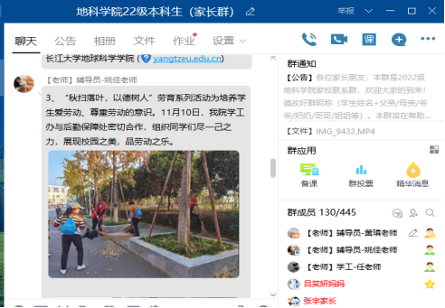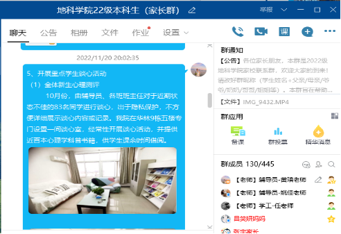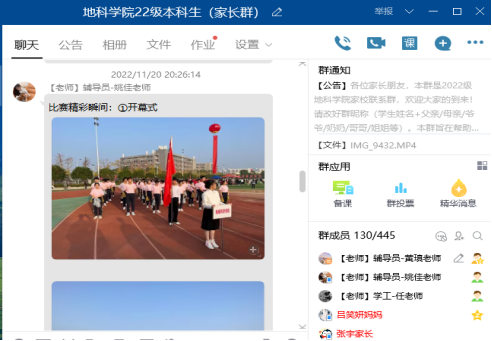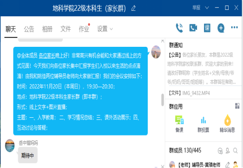 (通讯员黄瑱 姚佳)为加强家校联系,打造协同育人体系,色情影片 于11月20日晚7时30分通过QQ群,召开线上2022级本科新生家长会。学院党委副书记任倩、年级辅导员黄瑱、姚佳及300余名新生家长参会。
