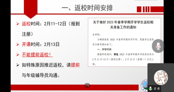 主题班会从返校时间安排、返校步骤、新冠病毒感染疫情防控操作指南学习、春季学期重点工作四个方面展开。首先,辅导员老师为同学们讲解了返校及开学的时间安排,并向大家强调不能擅自提前返校。接下来,辅导员老师对返校的6步骤逐一进行了讲解,特别是对“打卡”和“申报”环节,要求返校学生必须保证连续7天健康打卡,延迟返校学生需严格办理延迟返校手续。随后,组织全体学生集中学习了《新冠病毒感染疫情防控操作指南》,要求科学做好检测,确保疫苗“应接尽接”,倡导做好个人防护。最后将期末考试、英语四六级考试、毕业生就业及考研复试工作进行了强调与动员,特别强调了考风考纪,要求参考学生严格遵守考试纪律。