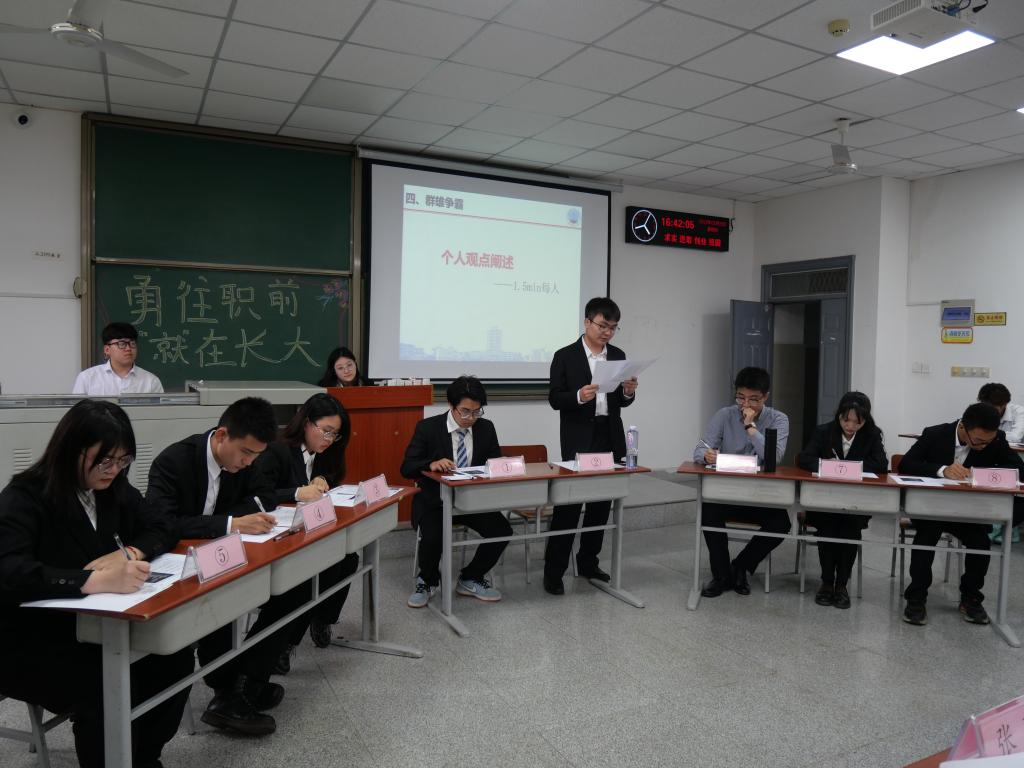 在比赛过程中,选手纷纷根据自身优势在有限的时间内将自己“推销”出去;面对评委的提问,选手们镇静自若、逻辑清晰、回答流畅;在无领导小组讨论环节,选手们围绕提问展开激烈讨论,展现出自己的风采。