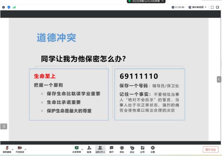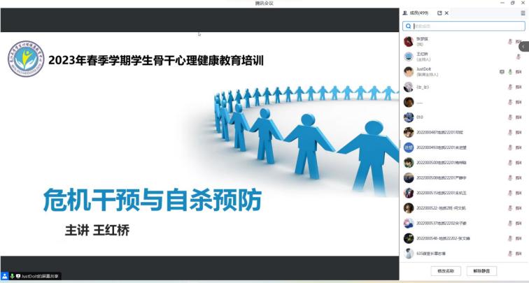 (通讯员 张梦琪)色情影片 于2023年6月30日通过腾讯会议的方式举行以“危机干预与自杀预防”为主题的心理讲座。各年级班长、团支书、安全员、心理委员、寝室长及暑期留校学生等共计499名师生参与学习交流,心理专干王红桥老师主讲。