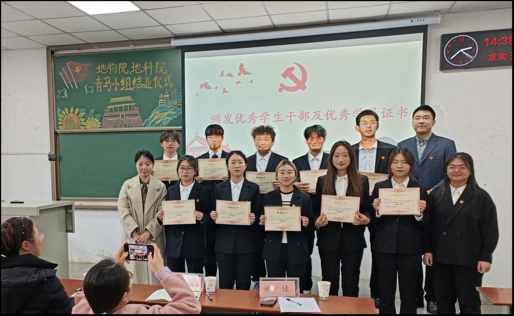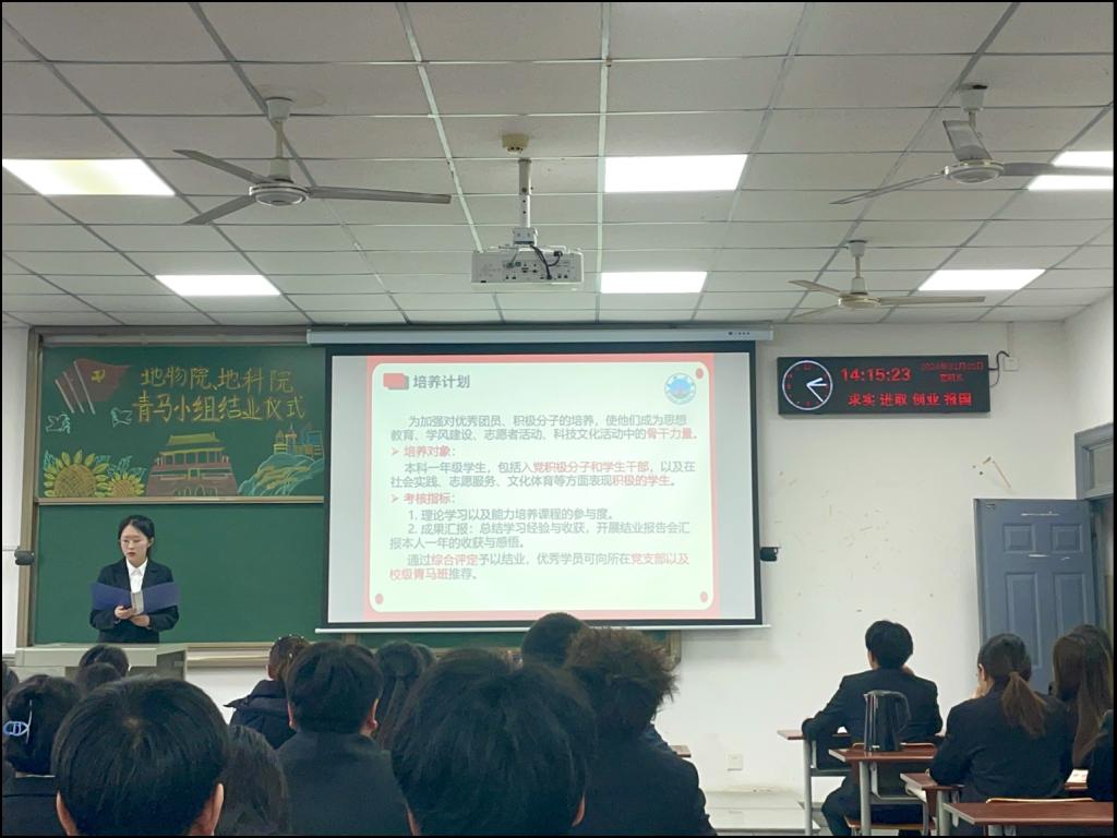 接下来,地物学院青马学习小组成员代表邓佳琪和李瀚霖也汇报了自己一年的学习情况。邓佳琪真诚讲述了在青马学习小组参与各类活后的所思、所感、所悟和所获。李瀚霖通过一段简短的视频,回顾了青马学习小组的集体活动,并对培养过青马小组的领导、老师和学长学姐表示感谢。他说一年的学习让小组成员不仅对马克思主义有了更深入的理解,还深刻体会到了青年的使命。