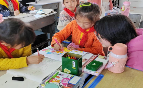 美术组的志愿者们温柔耐心地对同学们进行了绘画教学。志愿者们轻轻地握着孩子们温暖柔软的小手,从构图到勾勒大致轮廓,再到填色。画笔在画纸上跳跃,色彩在指尖流淌,为一幅幅画作赋予了生命。绘画是小朋友们表达自己的方式,他们用色彩和形状展现出自己的情感和想法,画笔轻扬,色彩斑斓,创意无限。