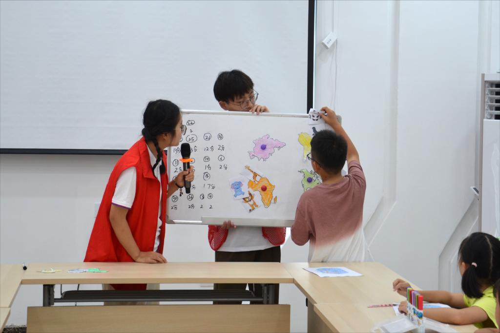 7月12日,实践队志愿者们精心策划将安全教育与地理知识相结合,先为孩子们讲解了大陆板块的奥秘,通过生动有趣的比喻,将板块运动比作动物的迁徙,成功地吸引了孩子们的注意力。紧接着将板块运动引伸到地质灾害的领域,以洪水和地震为例,详细讲解了灾害发生的原因、预防措施以及应急逃生的方法。“地震是板块运动引起的……”“水位上涨淹没房屋我们应该往高处逃离……”各年龄段孩子都能够掌握必备的安全知识和技能,积极回答问题,表现出了极高的热情和专注。