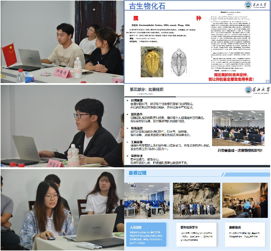 接下来,宋嘉林、吴金鑫和詹明月三位同学,分别从“地质标本鉴定”、“地质技能综合应用”、“野外地质技能”三个竞赛类别分享了自己的备赛和比赛经验。宋嘉林提醒同学们重视用肉眼和显微镜观察鉴定岩石这一基本功,平时尽量按照竞赛要求完成实验及报告,多走进实验室和大自然中,从实践中学习。他还向大家推荐了大量权威参考书目和专业学习网站。吴金鑫分享了自己学习MapGIS和SECTION等专业软件的方法,鼓励大家多练习,多思考,找寻适合自己的学习方法,提升学习效率。詹明月分享了“野外地质技能”项目的具体竞赛过程,对比了比赛试题与日常训练之间的差异,希望同学们有好的身体,保持好的心态,她还回忆了暑期在刘家场实习基地备赛的辛苦与快乐。“我收获了友谊,更收获了知识,这段经历是我一生的保贵财富。”詹明月如是说。