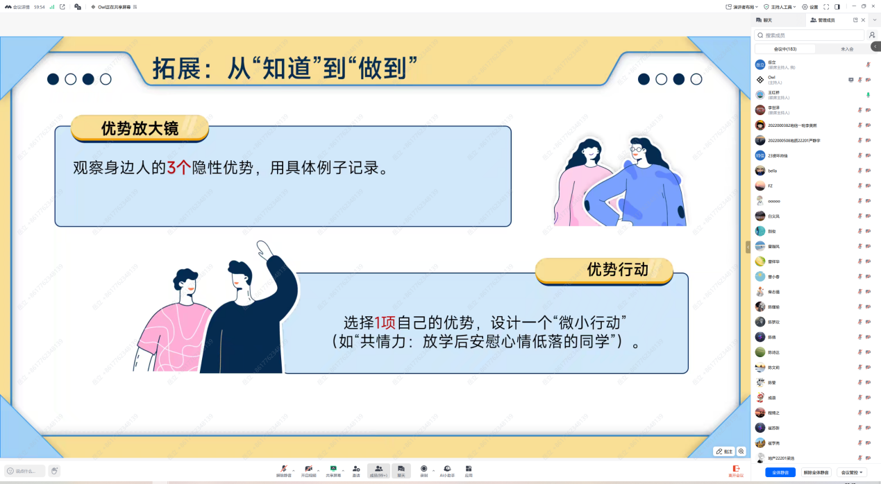此外,王老师强调了学生骨干在校园心理健康工作中的重要作用,邀请大家履行职责,以身作则做示范、宣传知识、关注同学动态并及时反馈、推荐有需要的同学寻求专业帮助。培训最后还介绍了心理中心的服务项目与学校四级心理危机干预体系的运作机制,呼吁大家积极参与心理健康教育,共筑校园心理防护网。