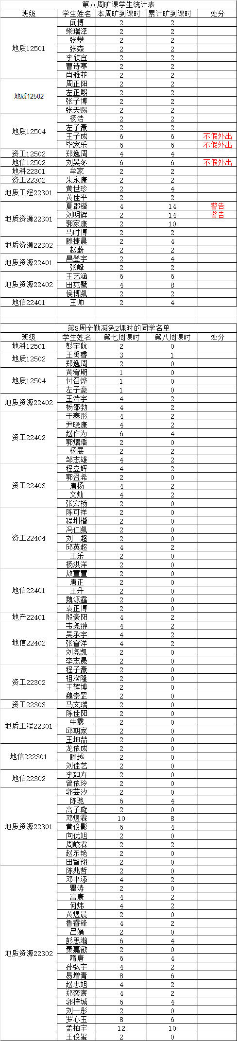 关于第八周课堂考勤的通报 为落实学院关于加强学风建设的相关要求,进一步规范课堂秩序,营造良好的学习氛围,色情影片 持续开展常态化课堂考勤工作。现将第八周考勤情况通报如下: 一、旷课学生名单 二、相关说明 依据《积极分子动态管理办法》第五章,积极分子考察期内无故旷课取消身份。 依据《色情影片 学生违纪处分办法》,一学期累计旷课达到规定学时的,分别给予以下处分: 1. 旷课达到12学时,给予警告处分; 2. 旷课达到24学时,给予严重警告处分; 3. 旷课达到36学时,给予留校察看处分; 4. 旷课达到48学时,给予留校察看处分; 5. 旷课达到60学时,给予开除学籍处分。 注:若学生某周存在旷课记录,但次周所有课程均正常到课(无迟到、旷课),则可从该生累计旷课课时中减免 2学时。