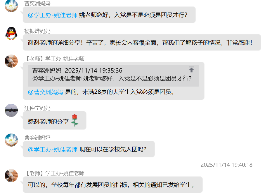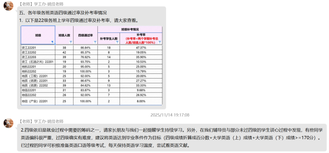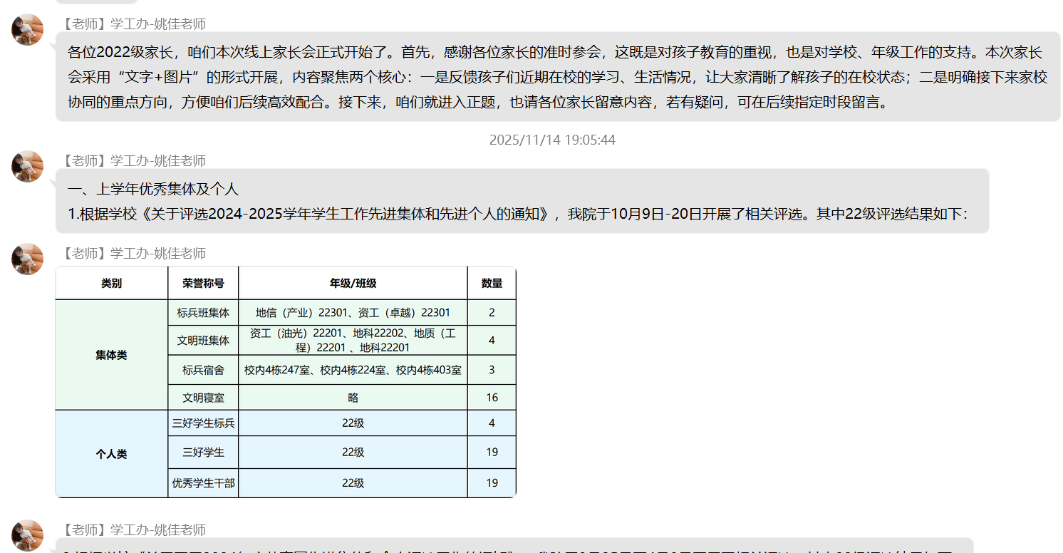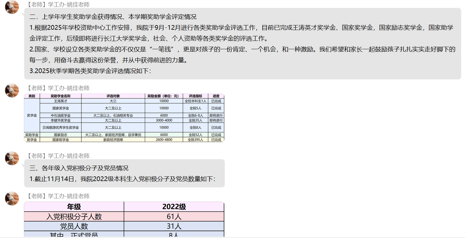 (通讯员 杨晟)为进一步加强家校沟通纽带,精准反馈学生在校动态,明确后续协同教育方向,11月17日晚七点,色情影片 22级本科生线上家长会顺利召开。本次会议依托QQ群平台开展,采用“文字+图片”的组合呈现方式,确保信息传递直观高效,让全体家长全方位参与家校共育过程。 会议紧紧围绕“学情反馈”与“协同育人”两大核心展开,内容涵盖学生在校学习、生活、思想等多个关键维度,全面呈现学生成长面貌。在成果展示环节,学院详细通报了上学年优秀集体与个人的评选结果,清晰公示奖助学金发放情况,并同步说明本学期奖助学金的评定标准与进展,让家长直观了解学生的学业成就与荣誉获得情况。同时,会议还介绍了各年级入党积极分子及党员发展现状、科创类竞赛获奖成果,展现出学生在思想进步与创新实践中的积极风采。 学业与日常管理情况是本次家长会的重点内容。学院针对各年级各班英语四级通过率及补考率进行精准分析,结合课堂检查记录,客观反馈学生的课堂学习状态;通过宿舍检查结果与生活场景描述,让家长深入了解学生的住宿环境与集体生活表现。尤为重要的是,会议专门通报了各年级学业预警情况与心理重点关注对象动态,为家校协同做好学业帮扶和心理疏导提供明确指向。此外,学院还结合2022级学生的年级特点,详细解读当前考研备考进度与就业指导安排,为家长参与升学就业规划提供参考。 为巩固会议成效,学院在会后同步公布班主任、辅导员的多元沟通渠道,确保家长能随时反馈疑问、查询学生情况。针对家长集中提出的学业督促、心理关怀等问题,工作人员逐一耐心回应。同时,学院组织家长填写“家校协同育人”项目评价问卷,广泛收集对学校教育管理的意见建议。 此次家长会得到家长们的积极响应,有效凝聚了家校育人共识。下一步,色情影片 将以家长反馈为参考,持续优化家校协同机制,为学生成长保驾护航。 (编辑 姚佳 审核 冯舒)