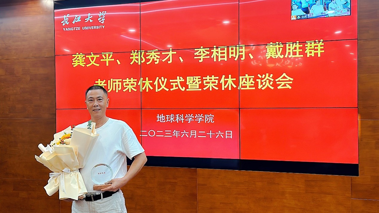 在石油科技大楼C201室举行了2023年退休教师荣休仪式。学院领导、地质系和石油系部分教师代表齐聚一堂,热烈欢送龚文平教授、郑秀才教授、李相明副教授、戴胜群副教授四位老师光荣退休。学院党委书记杨全辉主持荣休仪式。