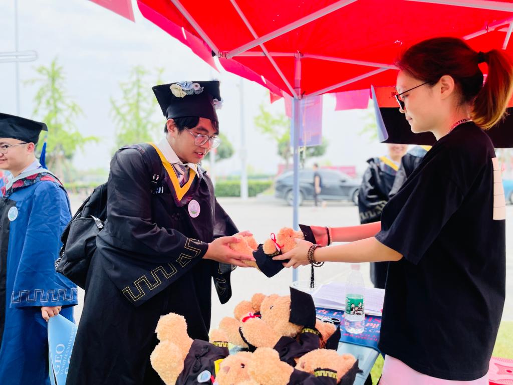 学生原创设计的鼠标垫、印有学院元素的帆布包,寄托着学院对毕业生“前程似锦,一路生花”的殷切期盼。
