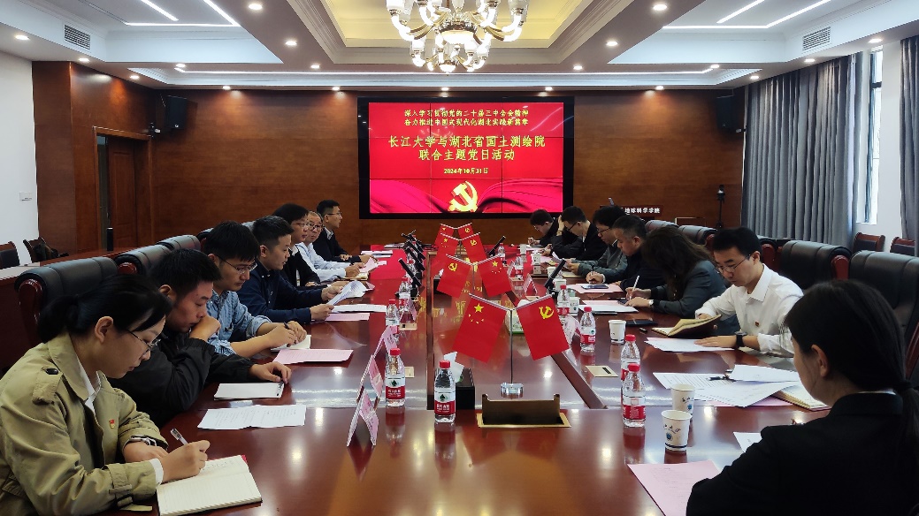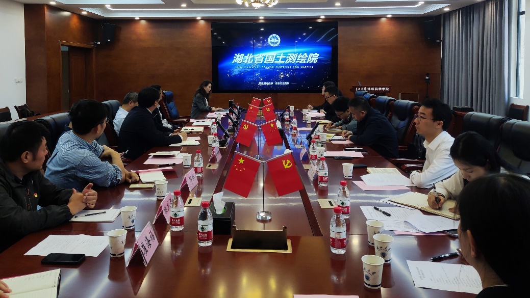 地信系教工党支部与湖北省国土测绘院航测遥感中心党支部、国土空间规划中心党支部开展了联合主题党日活动,活动以“深入学习贯彻党的二十届三中全会精神,奋力推进中国式现代化湖北实践新篇章”为主题,党建引领,业务融合,深入交流,共谋发展。湖北省国土测绘院党委委员、副院长熊中招,航测遥感中心党支部书记、主任谢菲,国土空间规划中心党支部书记、主任杨莉,学院党委书记杨全辉,副院长李功权,地信系教工党支部书记邵燕林,地信系主任刘远刚及双方部分党员代表参加了此次联合主题党日活动,地信系教工党支部书记邵燕林主持活动。