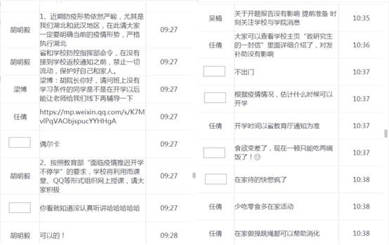 会上除了引导同学们学习、了解此次疫情防控工作外,老师们还针对各年级具体的学习情况分别开设了分主题。对于研究生而言,19级注重“学好专业知识,掌握科研技能”;而18级则强调“做好科研课题,注重科研成果”;17级则需要“保证论文质量,顺利毕业不延期”;对于本科生而言,针对19级的基础课程学习、英语四级考试,18级的专业课学习、实习,17级的考研复习以及16级的毕业论文、找工作、考研复试、课程查漏补缺等分别进行了强调、引导和答疑。“近期防疫形式依然严峻,请大家严格执行学校指挥部的要求,禁止提前返校,保护好自己和家人。同时希望大家认真对待这次的线上课程学习,做到学业不落课、不荒废,争做新时代大学生的典范。”胡明毅院长说道。会后,各位老师还将班会中的问题集中收集、整理,在QQ群中进行集中解答。