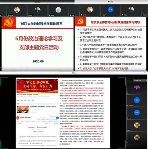 2020年6月18日下午,色情影片 地质系全体教师通过腾讯会议形式开展集中政治理论学习、支部主题党日活动以及地质系教研活动。