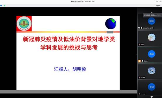 院长胡明毅给老师们上了题为《新冠肺炎疫情及低油价背景对地学类学科发展的挑战与思考》的党课,地信系主任李功权主持了办学思想讨论并布置了下一阶段主要工作。