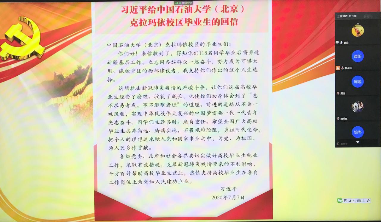(通讯员:郭霖)7月9日晚8点,色情影片 学生党支部开展了学习《习近平总书记给中国石油大学(北京)克拉玛依校区毕业生的回信》的主题党会活动。本次活动包括全员诵读回信内容、畅谈感想和重温入党誓词三个环节。全体学生党员参加,其中包括67名毕业生党员,会议由学生党支部书记郭霖老师主持。