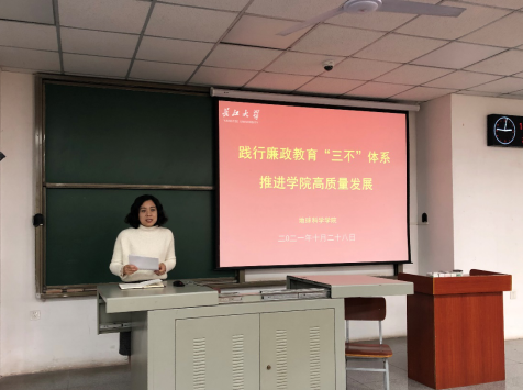 最后,党委副书记任倩为与会教职工上了一堂生动的党风廉政教育党课。党课围绕“党风廉政建设‘三不’体系”为主题,从统筹联动,科学有效地防治腐败和践行“三不”标准,筑牢廉洁防线两个方面深入展开。任倩指出,为促进“三不”的有机结合,要着眼“不敢”,强化政治监督;要聚焦“不能”,注重建章立制;要立足“不想”,激发担当意识。同时,要以上率下,践行“三不”标准,提升廉政教育领导力,强化广大党员干部法纪和规矩意识,为学院的发展,营造风清气正的良好校园风尚。任倩号召各系、机关各科室要将党风廉政、意识形态、师德师风三项建设统筹起来,抓好责任落实,明确发展目标,制定具体工作举措,全面提升本科及研究生教学质量,大力推进科学研究何实验室平台建设,加强师资队伍建设,从而有力推进学院高质量发展。