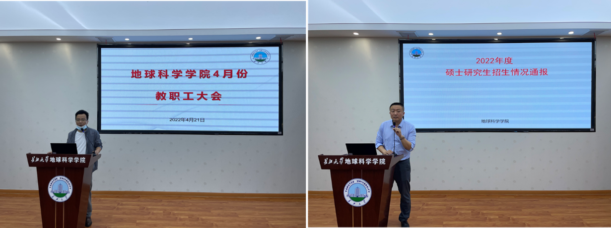 最后院长胡明毅通报了学院2022年人才招聘、国重实验室申报及第五届国际古地理学会议筹备等各项工作进展情况,并从人才培养、一流专业和学科建设、实验室平台建设等方面部署近期重点工作,对全院教职工提出了明确的要求和希望,希望学院全体教职工凝心聚力,团结一致,围绕学院2022年中心任务,攻坚克难,争取再创佳绩。