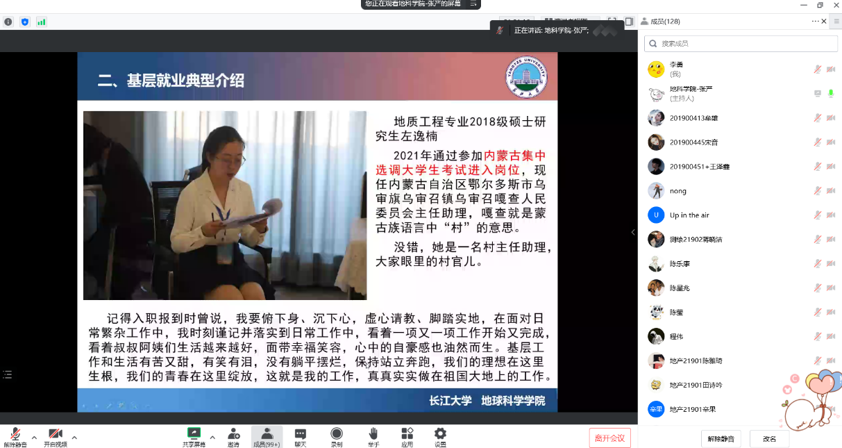 在就业育人主题班会上,学院以21届优秀毕业生左逸楠、唐帅为例介绍了基层就业典型案例,讲述了毕业生通过考取公务员和参军入伍等职业途径在基层发光发热的优秀事迹,引导学生做新时代新青年,把个人理想追求融入到党和国家事业之中,树立崇高的职业理想,鼓励更多毕业生到基层去、到西部去、到祖国需要的地方去建功立业、实现人生价值。