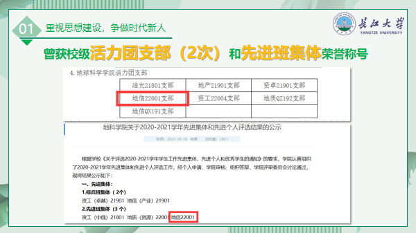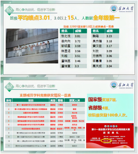 单项奖学金”,两人担任校级组织重要负责人的角色。全班平均绩点3.01,四级通过率100%,六级通过率60%。在各类考试中,严肃考风考纪,未出现一例违纪现象。全班最高绩点为4.63,专业前十名本班有三位同学,多名同学通过计算机二级等专业认证。在辅导员和班主任的管理下,严谨的学风铸就了不怕苦不怕累的拼搏精神,良好的学习氛围也使班集体在全校脱颖而出。我班同学获得“第十一届全国大学生GIS应用技能大赛”全国一等奖;“第十五届全国大学生计算机设计大赛”全国三等奖一项、省部级一等奖一项;“全国大学生英语竞赛”全国三等奖;“易智瑞全国大学生GIS软件开发竞赛”全国三等奖两项;“第三届湖北省GIS应用技能大赛”特等奖;“第十二届全国大学生电子商务三创赛”湖北省一等奖;“蓝桥杯全国软件和信息技术专业人才大赛”省级三等奖。目前共有超半数的同学参加大创项目,其中国家级项目一项,省级项目两项,共发表一篇核心期刊、一项软件著作权,其中国家级大创项目“麦朴志愿”已正式投入使用。
