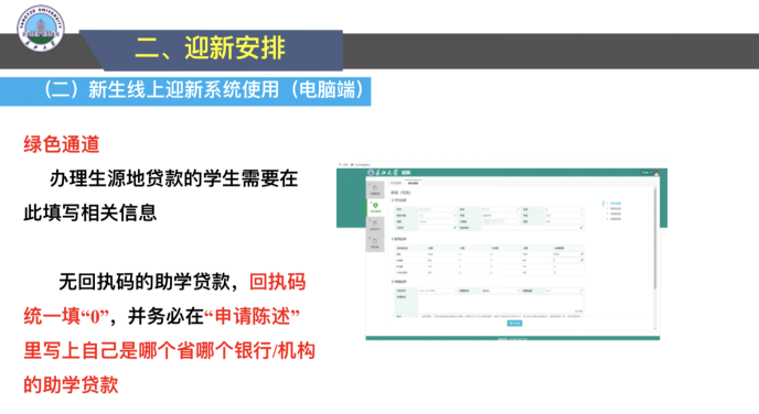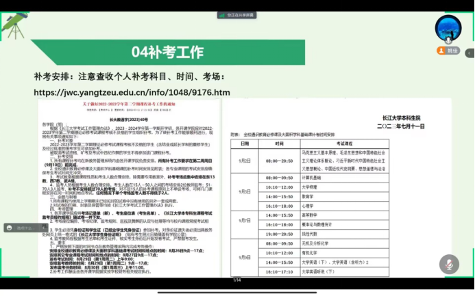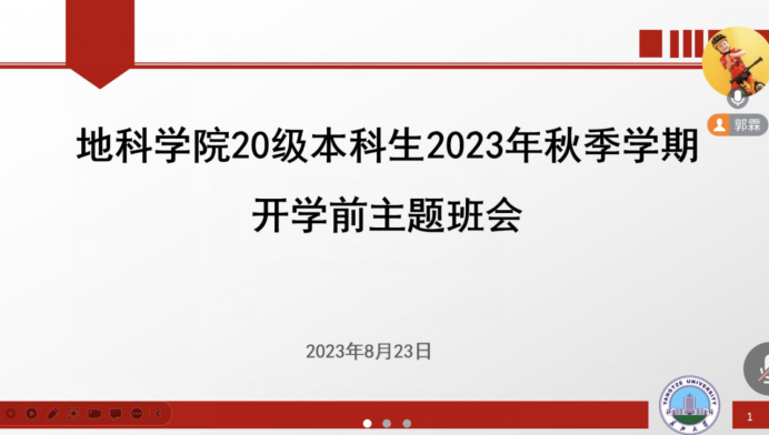 2023级新生及家长见面会”,辅导员乔宇老师分别从学校概况、迎新安排、开学前安全教育和大家关心的其他事项四个方面向新同学以及家长做了详细介绍。此外还邀请到了地科22301班班主任陈旭老师讲话,他寄语同学们珍惜大学时光,合理规划时间,树立远大理想,为社会主义现代化建设贡献自己的力量。最后乔老师对学生及家长的提问逐一进行解答,提醒同学们假期内要保障自身安全,期待在知音湖畔与同学们相见!