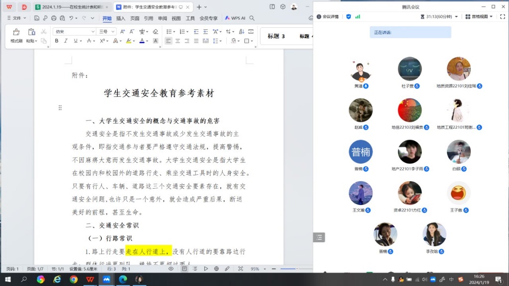 由学工办老师带队,通过线上线下相结合的方式开展交通安全教育专题班会。通过普及交通安全法规、分享交通事故典型案例,引导同学们互动讨论,强化对步行、骑车、乘车、水上交通等出行方式的安全宣传教育,引导同学们牢固树立“安全重于泰山”的责任意识,克服麻痹思想和侥幸心理,自觉遵守交通法规,维护校内外交通秩序。