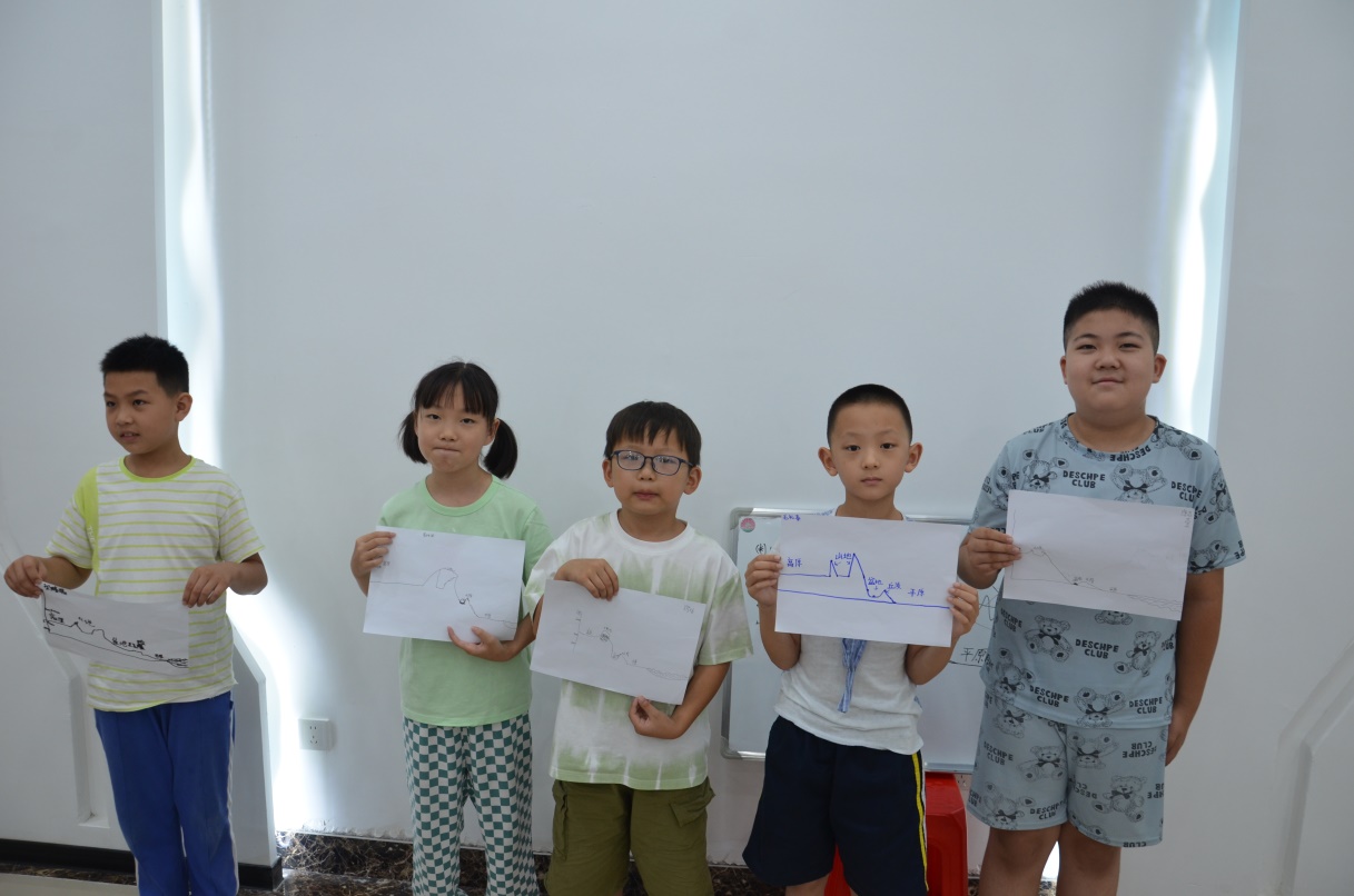 7月9日的第二场地质科普课,志愿者们临摹出中国地图轮廓,运用打印出来的三幅彩图,生动形象的介绍了长江和黄河的发源地以及其重要支流。巧妙地将上节课“水由于重力总是向着低处流”这一知识点延伸到本节课中,帮助孩子们理解中国地形的三大阶梯以及西高东低的地形特征。