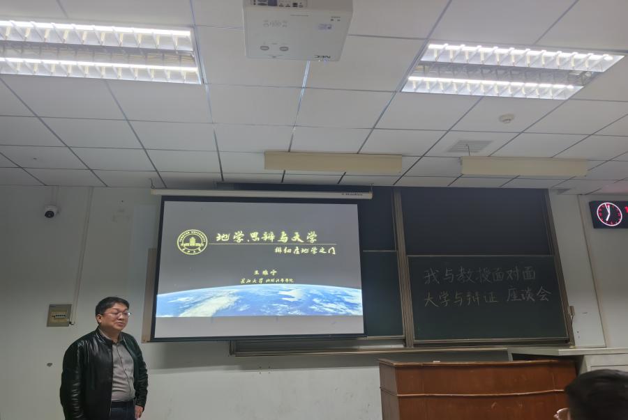 王老师围绕 “地学概括” 和 “地学思辨” 两大角度深入剖析,全面且细致地从地学内容的基础性、时代性、思政性、系统性和哲学性等多维度阐述了地学内容,讲解时代性时,结合当下最新的科研成果和社会发展对地学的需求,让同学们感受到地学与时俱进的活力;针对宇宙新生的正负性、地质作用的内外动力以及海德尔 “宇宙—地球—人” 的循环性等内容进行了精彩阐述。他深入浅出的讲解,引导同学们从辩证的视角看待地学现象和理论,激发了同学们的思维碰撞,如同在同学们心间种下了思辨的种子,为他们今后深入研究地学问题开启了智慧之门。