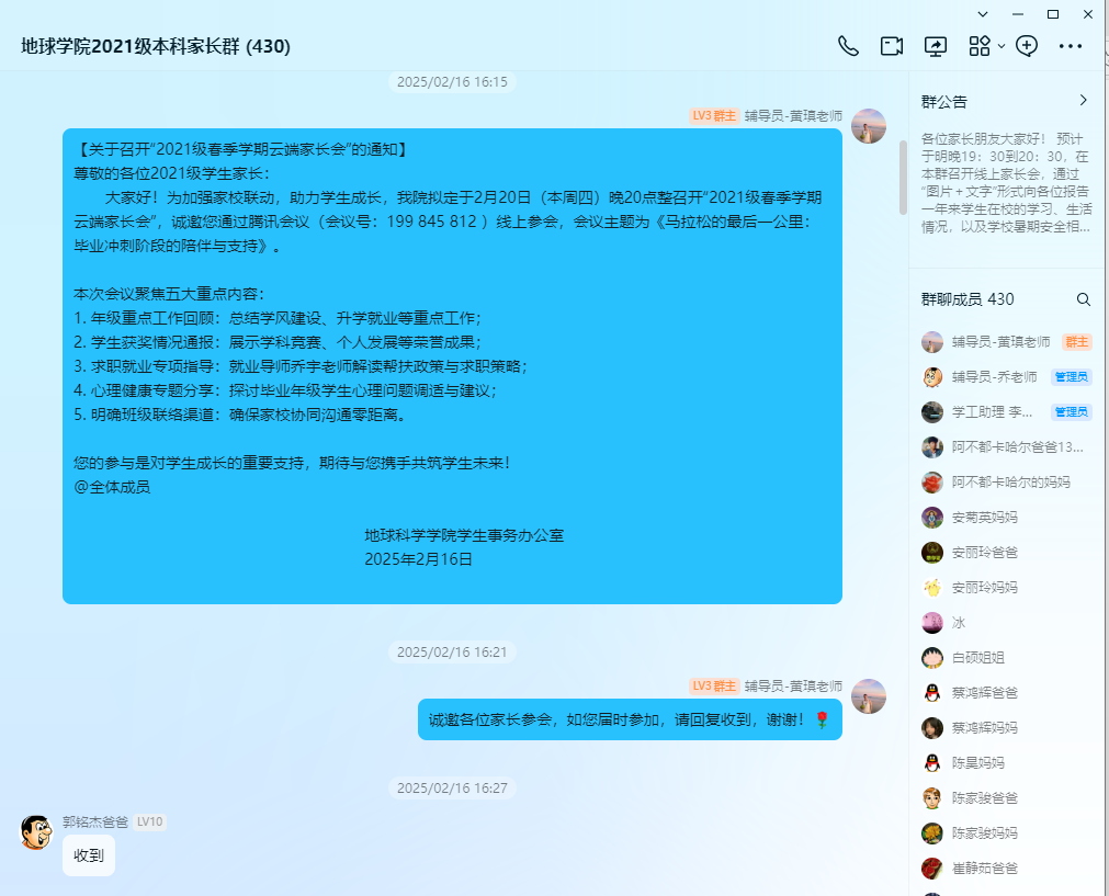 以“马拉松的最后一公里:毕业冲刺阶段的陪伴与支持”为主题,通过腾讯会议组织召开了2021级本科生春季学期开学初家长会。会议由年级辅导员黄瑱主讲,围绕毕业阶段重点工作与家校协同育人展开深入交流,旨在凝聚家校合力,助力学生顺利毕业、平稳过渡。