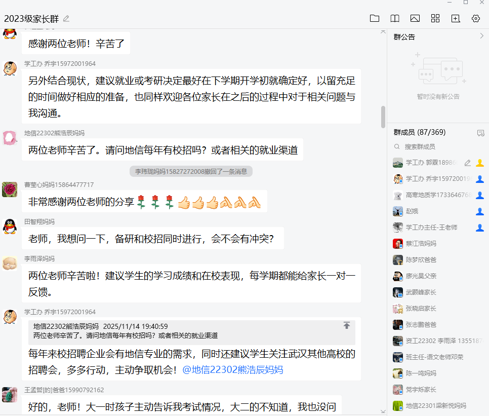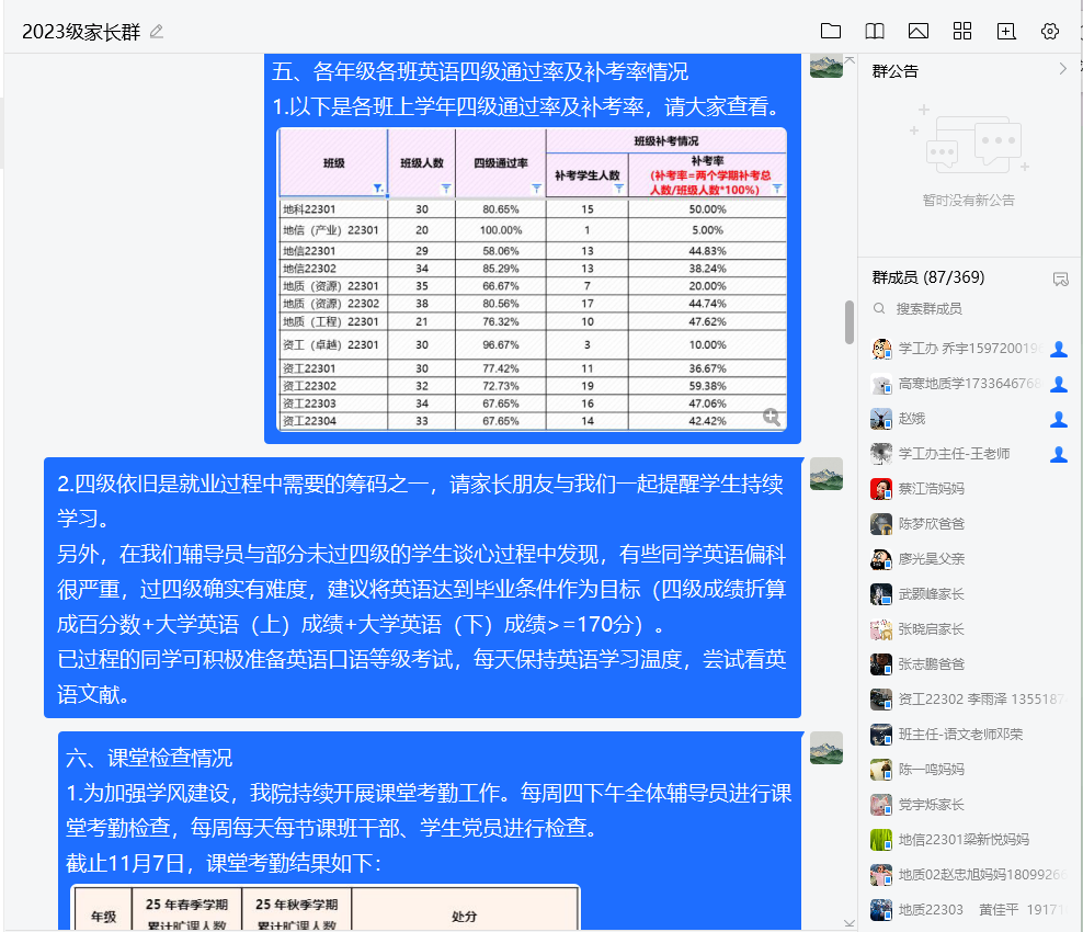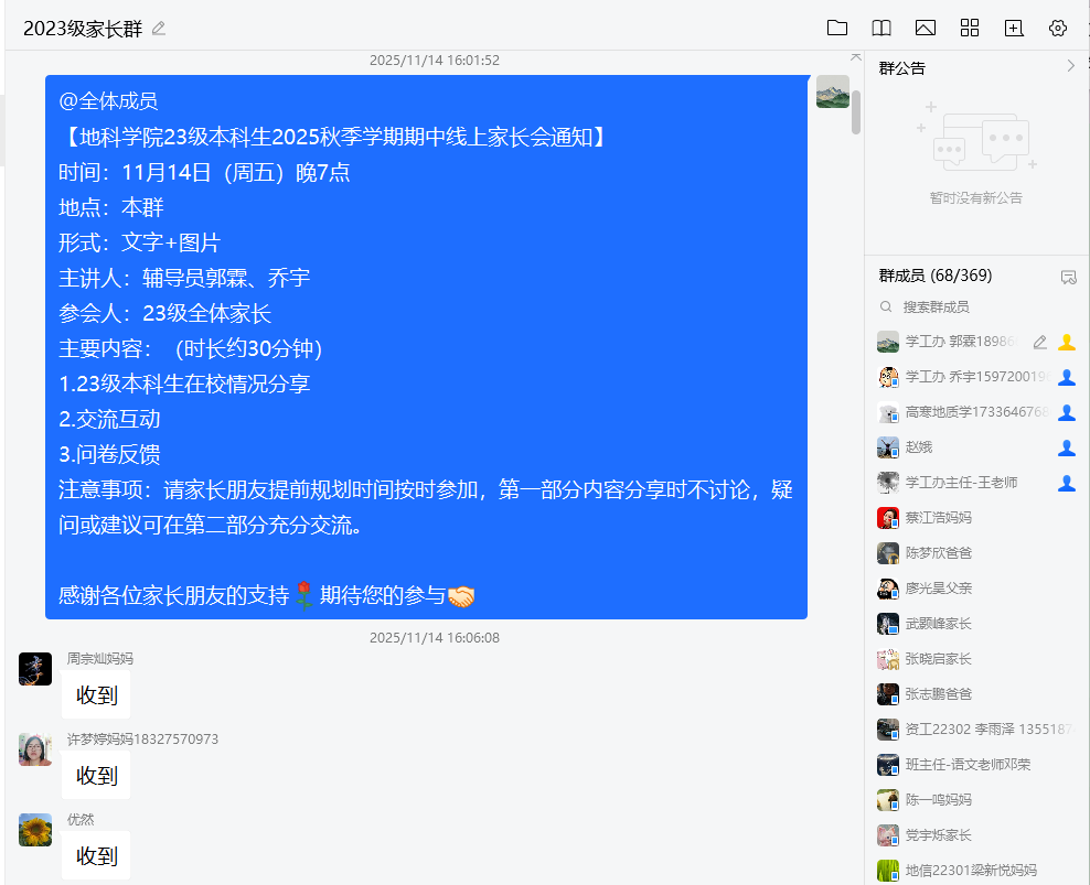 23级本科生本学期期中线上家长会顺利开展。会议由辅导员郭霖和乔宇两位老师主讲,全体23级家长参与。会议以“文字+图片”的形式,聚焦学生学业发展、生涯规划与心理健康等核心议题,旨在深化家校协同育人,共同助力学生成长。