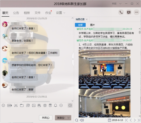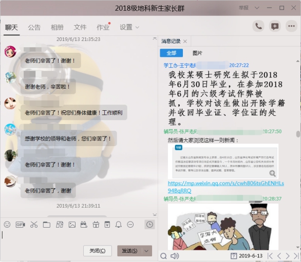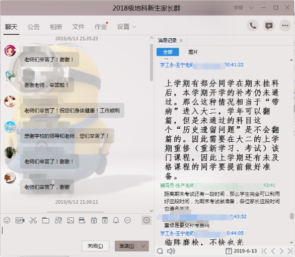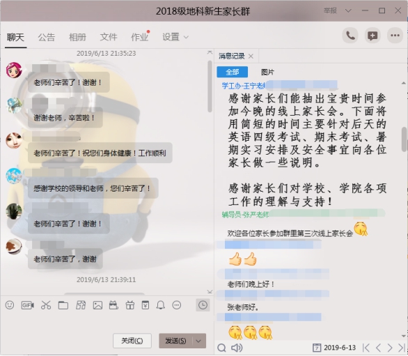 在“2018级地科新生家长群”中召开了主题为“诚信应考,平安一夏”2018级本科生第三次线上家长会,学院党委副书记任倩、辅导员潘志远、张严以及学生家长共计140余人参与了讨论,家长会由年级辅导员王宁主持。