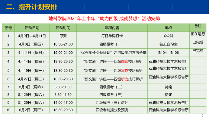 大会伊始,郭老师对4月8日组织的第一次四级模考情况进行了通报,指出了同学们普遍存在的问题,并且再次向大家阐述了四级证书的重要性。随后,郭老师向同学们具体介绍了学院为大家精心制定的“助力四级 成就梦想”系列活动安排,倡议以班为单位建立学习小组,分班制定学习计划并落实。她鼓励同学们珍惜每次学习机会,用“坚持”与“高效”备战英语四级。