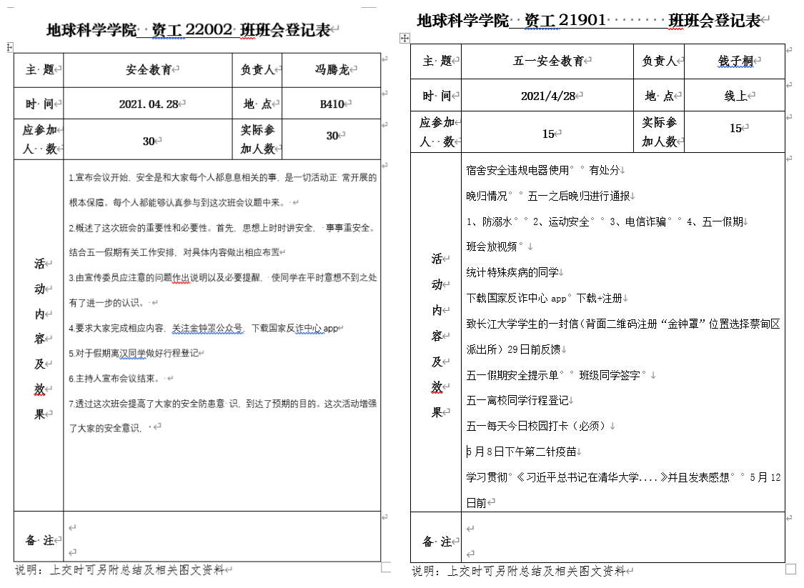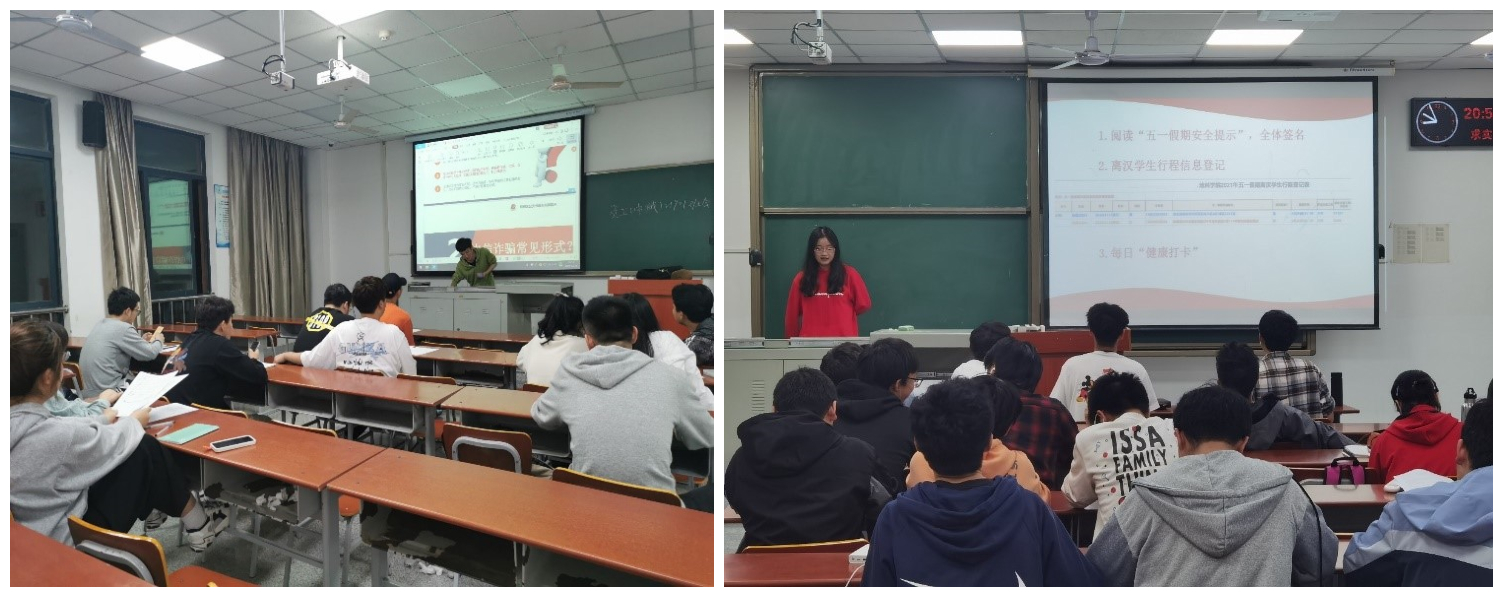 学生宿舍使用违规电器和晚归情况,并对事件危害进行了分析,提醒大家务必遵守学校相关规定,安全高于一切。二是五一假期安全。要求各班班长召开安全主题班会,在班会上做好防溺水、运动安全、防电信诈骗和五一假期安全四个方面的教育,重点做好“国家反诈中心”APP和微信公众号“金钟罩”的下载与认证、假期离汉学生的行程登记、假期安全教育告知书的签收等。