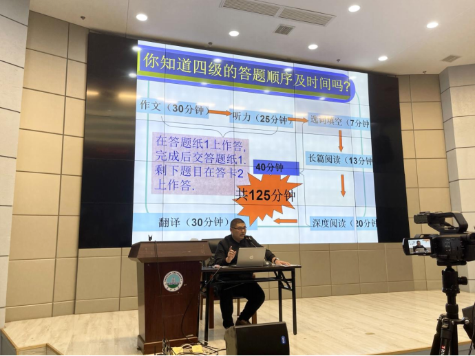 在4月14日的“新文道”四级阅读技巧解析讲座上,主讲人廖青老师向同学们重点讲解了如何从语法角度快速辨别词性,及在标注词性时应该注意的问题,并提醒同学们,考生考试时间不充裕时,应精读题干,定位关键词,对于细节题,要在题干中准确定位,再按段落顺序寻找答案,这样更起到事半功倍的效果。
