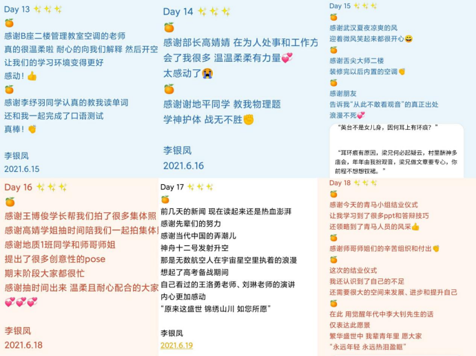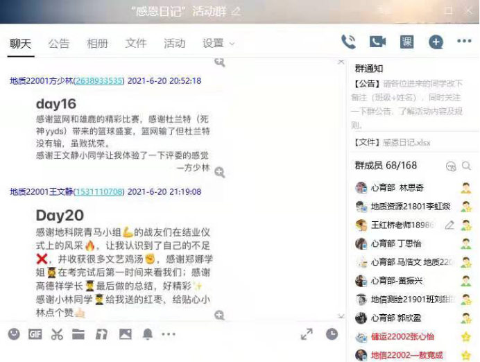 从神州升空先辈们的努力、到耐心答疑的专任教师;从给予自己生命和爱的爸爸到热心的班委、给自己带饭的室友、组织四级模考的师兄师姐;从图书馆的空调到炎夏的冰西瓜......在QQ群中,每天晚上是最热闹的时候,同学们争相分享、互动,记录当天获得支持与帮助,与这支持带给自己的益处和感受。地信(测绘)21901班刘景洁写道:“感恩这个活动,让我每天都有一小段时间回想快乐的时光,发现了很多平常可能会忽略的人和事,同时也能和小伙伴一起分享快乐,很治愈”。从不知道如何落笔,到侃侃而谈,在最后一天的日记中,地质22001班李银凤写道“原来每天都有值得感谢的人和事,都是有意义且快乐的一天,回顾21天的日记,发现自己成长了不少”。