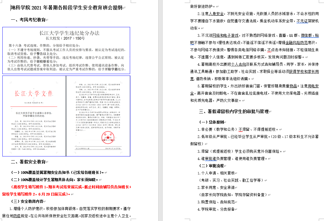 2021年暑期各阶段学生安全教育班会提纲》进一步保证班会效果。6月24日,各辅导员分年级组织召开了班长及安全员会议,重点讲解了安全教育班会的内容,并对如何开好班会及各类资料的收集进行了一一说明。