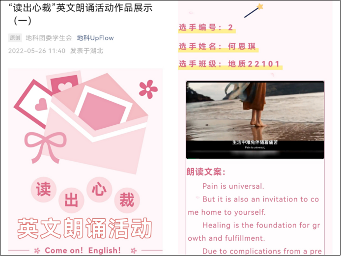 同学们态度认真,准备充分,活动共收到79名同学精心制作的参赛音频、视频,涵盖梦想、爱情、以书为友、战胜恐惧、寻找快乐、内向者优势、做真实的自己、感恩、睡眠、友谊等贴合生活、丰富多样的主题,官微推送累积观看达1240余人次。