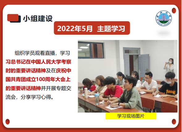 2021年12月,小组开展了两场理论学习培训,成员综合素质和团队凝聚力显著提高。今年1至3月,小组成员通过前往红色革命基地,结合十九届六中全会精神,进行党史研学,并开展了以“紧跟时代浪潮,赓续红色血脉”为主题的线下汇报与评比。为了传递研学成果,学员们在本班班团会上做了主题宣讲,受到广泛好评。本活动还受到省级媒体的关注。今年5月,学员集中观看直播,学习了习近平总书记在中国人民大学考察和建团百年重要讲话精神,并开展专题交流会,分享学习心得。今年7至9月,小组开展“学习旧足迹,奋进新征程”暑期实践活动,通过走访、查阅资料等方式,对党的十八大以来习近平总书记重要工作足迹进行学习,并制作学习视频,在学院新媒体平台进行展示。